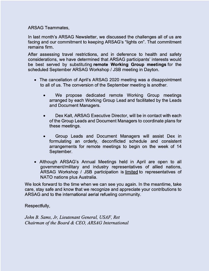 refueling. Aerial refueling innovations, developments, interoperability challenges, lessons learned are highlighted at ARSAG’s annual meetings through military status reports, seminars, military and industry briefings,